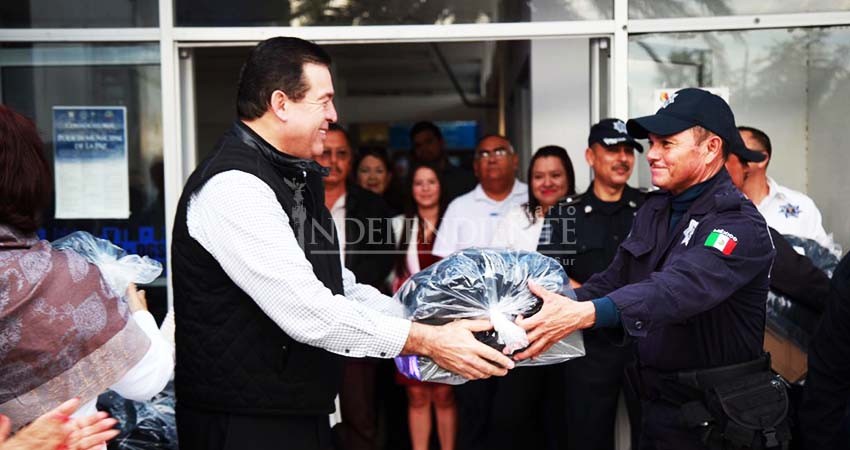 La Paz, Baja California Sur.- En cumplimiento de los estatutos normativos que rigen a la Dirección General de Seguridad Pública, Policía Preventiva y Tránsito Municipal de La Paz, el Alcalde Rubén Muñoz Álvarez, este lunes realizó la entrega de la dotación de uniformes y equipamiento de trabajo a los elementos que integran las diversas áreas operativas de la Policía Municipal, derivado de los recursos aplicados del Programa de Fortalecimiento para la Seguridad Pública Municipal (FORTASEG).