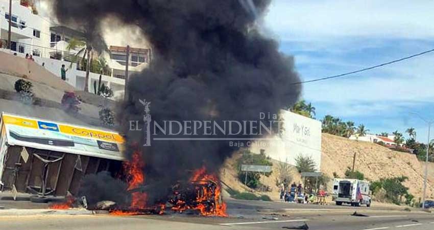 San José del Cabo, Baja California Sur. - Un amplio despliegue de las corporaciones de emergencia se registró al mediodía de hoy en San José del Cabo, luego de la volcadura e incendio de un vehículo propiedad de tiendas Coppel.