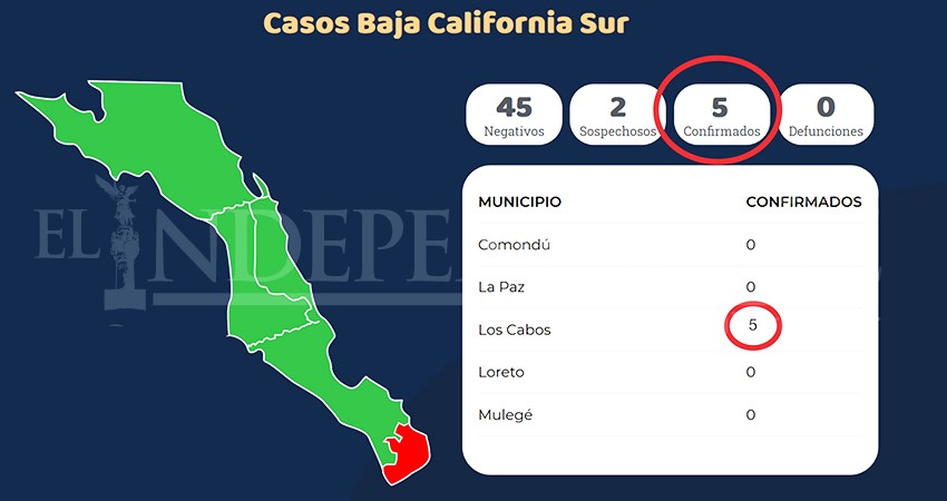 Los 5 casos se COVID-19 se encuentran en el municipio de Los Cabos, lugar donde se encuentran aisladas las primeras dos personas que presentaron la infección, apenas el fin de semana pasado.