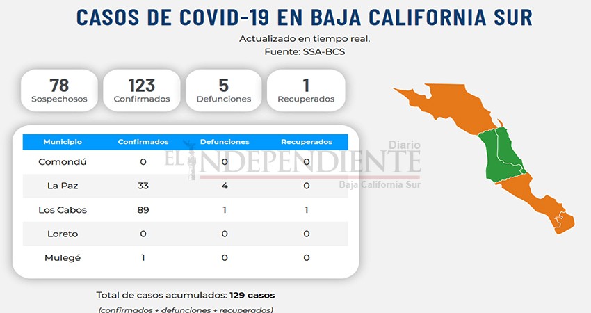 La Paz, Baja California Sur.- Durante este fin de semana Baja California Sur (BCS) no cruzó por una buena jornada, pues se acumularon 129 casos confirmados de coronavirus, entre ellos 5 defunciones entre ellos un médico del Instituto Mexicano del Seguro Social (Imss), además de 78 casos sospechosos.
