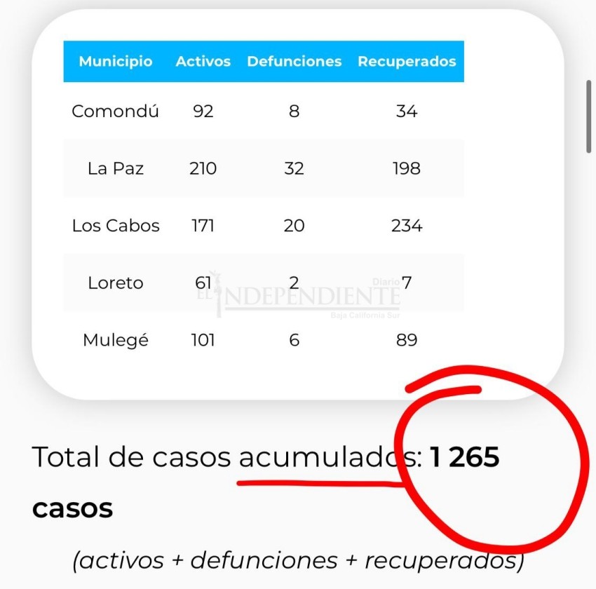 Estos nuevos registros de coronavirus se presentaron 7 en La Paz y 4 más en Loreto, el resto de los municipios no registraron infectados, estos casos elevaron la suma acumulada de pacientes COVID-19 a 1265, de los cuales 635 continúan activos.
