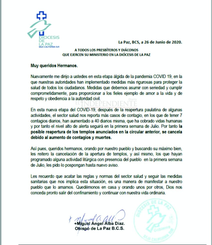 La Paz, Baja California Sur.- Tras haber anunciado la re apertura de manera paulatina de las iglesias en Baja California Sur (BCS) la primera semana de julio, el obispo de La Paz, Miguel Alba Díaz reculó ante el alto número de contagios que hay en La Paz e informó a través de un boletín de prensa que esta re apretura se cancelaba, así como las actividades que se hubieran programado para esos días.