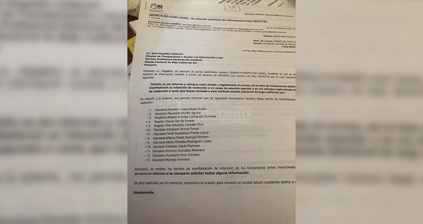 La Paz, Baja California Sur. Antes de que venciera el plazo, el pasado 20 de noviembre, 10 diputados presentaron su intención de reelegirse en sus distritos electorales, así lo manifestaron ante el Instituto Estatal Electoral (IEE) en Baja California Sur (BCS) mediante una carta de intención, como marca el reglamento.