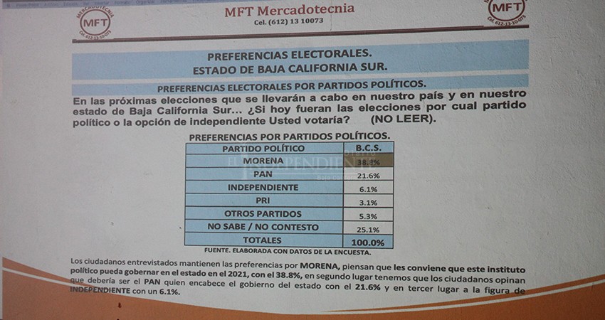 “La coalición Juntos Haremos Historia tiene una preferencia muy marcada sobre la alianza va por México, según los trabajos de encuesta con la población a lo largo de Baja California Sur, sin embargo, también hay un gran porcentaje del 20 por ciento de los votantes que no ha decidido a quien darle su voto este próximo junio”, indicó el director de la casa encuestadora. También dijo que, de manera histórica, sigue el Partido Revolucionario Institucional (PRI) siendo el instituto político más despreciado por la ciudadanía en el estado, con un 37.9 por ciento de desaprobación, seguido del Partido Acción Nacional (PAN), y confirmó que Morena también trae un 9 por ciento de desaprobación entre la población.