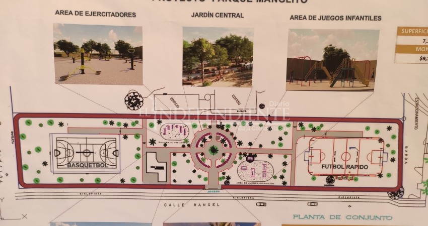 “La lucha social que iniciaron desde los asentamientos de la antigua Inalámbrica requerían de este barrio”, reconoció Rubén Muñoz, quien dio crédito a la organización BCSicletos, fincada en El Manglito, por apoyar en la organización que da origen a este parque. En este esperado espacio público se invertirán poco más de 9 millones de pesos, contará con área de ejercitadores, juegos infantiles, jardín central, centro comunitario, canchas de fútbol rápido y basquetbol en un área de 7 mil metros cuadrados.