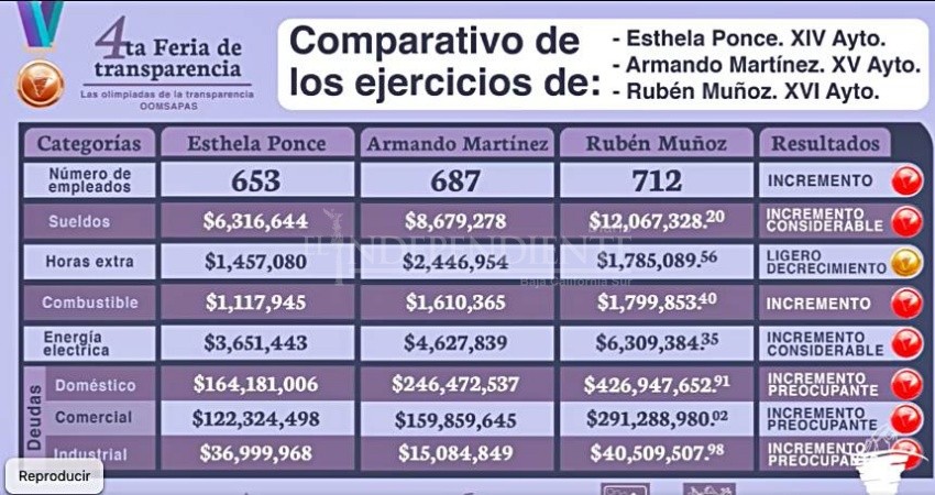 La Paz, Baja California Sur. Durante el ayuntamiento que dirigió Rubén Muñoz Álvarez, se dio un incremento millonario la cartera vencida de los usuarios del Organismo Operador Municipal del Sistema Agua Potable Alcantarillado y Saneamiento de La Paz (Oomsapas). Lo anterior trascendió a través de un ejercicio de transparencia conducido por las organizaciones de la sociedad organizada: Cómo Vamos La Paz y la Sociedad de Historia Natural Niparajá.