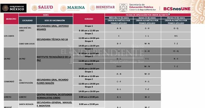 Por lo pronto, ayer se realizó un simulacro para la vacunación en el Instituto Tecnológico de La Paz, que será una de las 7 sedes, la única en este municipio.