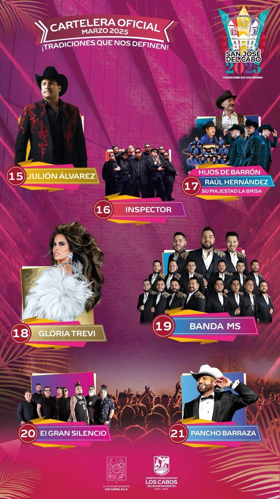 15 de marzo abriran con la presencia de Julión Álvarez, mientras que el 16 de marzo se presentará el grupo de rock Inspector para el