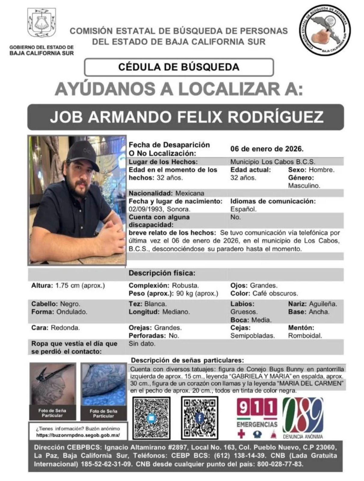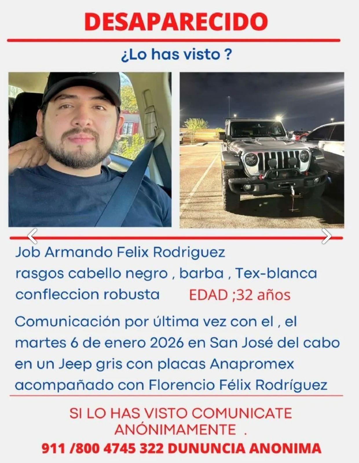 Los Cabos, Baja California Sur.- El colectivo Búsquedas de San José del Cabo (BCS) publicó un video en el que se reporta la desaparición de Job Armando Félix Rodríguez, de 32 años, el pasado 6 de enero, quien estaba en compañía de su hermano Florencio Félix Rodríguez, de 52 años.