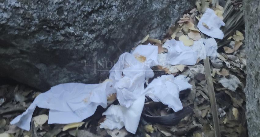 • Exponen acumulación de residuos sólidos, restos de papel higiénico dispersos entre la vegetación, costales con basura, botellas y desechos domésticos abandonados.