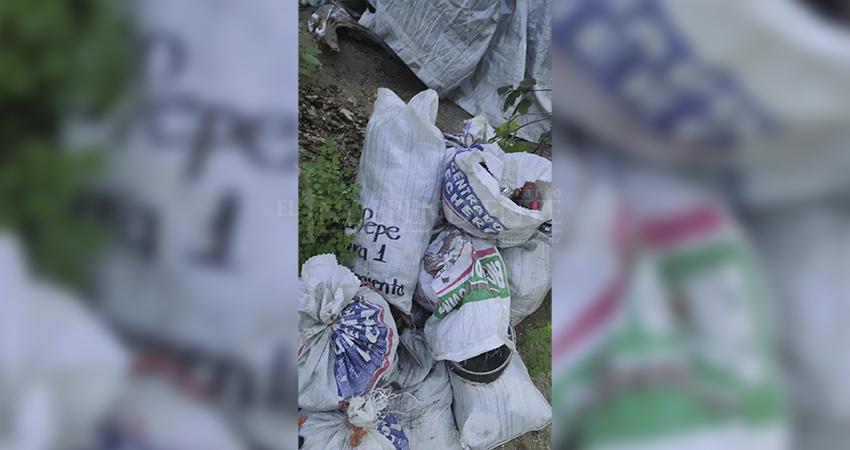 vegetación, costales con basura, botellas y desechos domésticos abandonados en